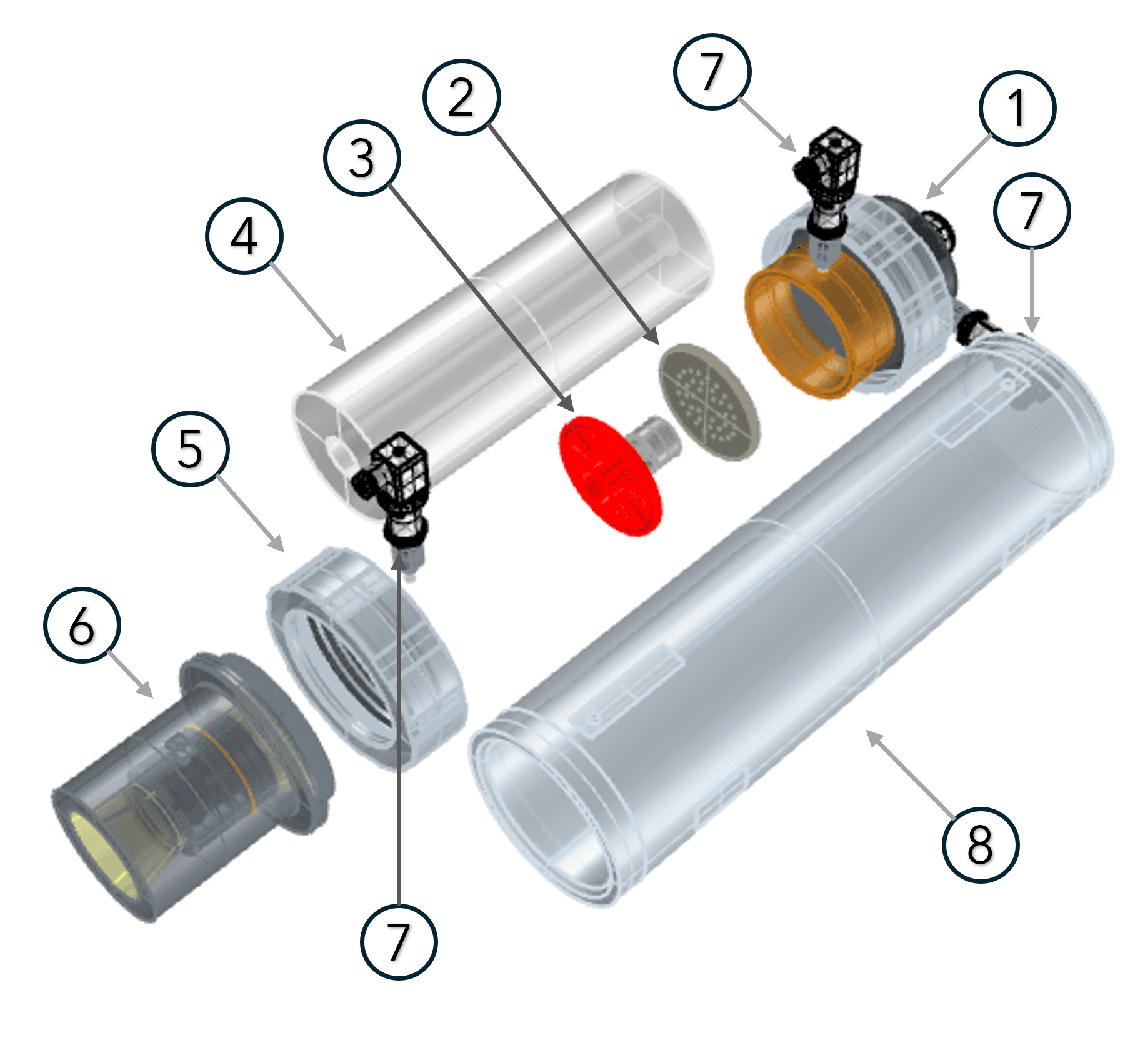 6. Exhaust Nozzle : an optimized shape exhaust to accelerate the gases to supersonic velocities and produce an increased thrust from the combustion while reducing over-expansion and under-expansion shocks.